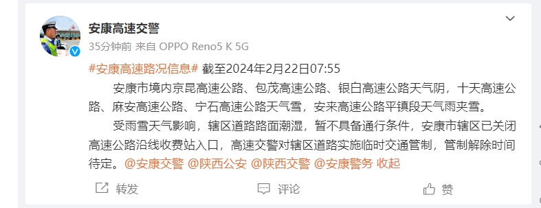 2月22日8時(shí)許,安康高速交警發(fā)布最新消息:截至2024年2月22日7:55安康市境內(nèi)京昆高速公路、包茂高速公路、銀白高速公路天氣陰,十天高速公路、麻安高速公路、寧石高速公路天氣雪,安來高速公路平鎮(zhèn)段天氣雨夾雪。HFP安康新聞網(wǎng)