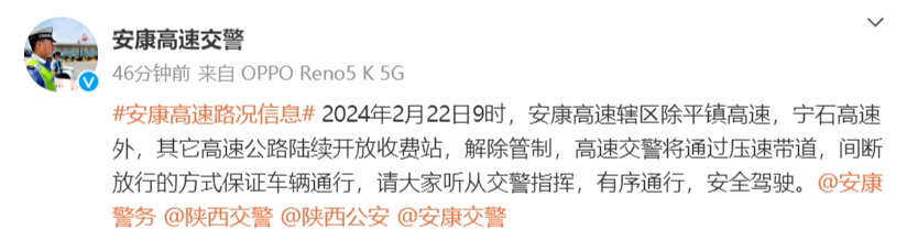 2月22日9時,安康高速交警發(fā)布通知:安康高速轄區(qū)除平鎮(zhèn)高速,寧石高速外,其它高速公路陸續(xù)開放收費站,解除管制,高速交警將通過壓速帶道,間斷放行的方式保證車輛通行。LPW安康新聞網(wǎng)