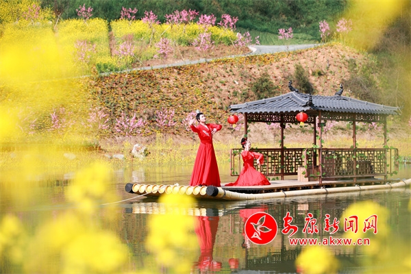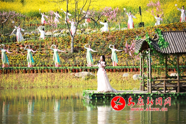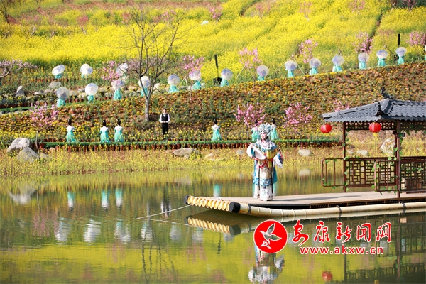 春日的水田溝村生機(jī)勃發(fā),漫山的油菜花在暖陽(yáng)下?tīng)?zhēng)相怒放,山坡下是一汪清澈的湖水;顒(dòng)依山就勢(shì)、水陸并用,將演員、舞臺(tái)、道具與水田溝村地形地貌完美融合,營(yíng)造出“人在畫(huà)中游,畫(huà)在景中走”的和美景象。隨著原創(chuàng)歌曲《水田溝的油菜花》悠揚(yáng)動(dòng)聽(tīng)的歌聲從湖面的小船傳來(lái),活動(dòng)正式拉開(kāi)帷幕,獨(dú)唱《問(wèn)春》、情景詩(shī)朗誦《母親河》、歌伴舞《醉美桃花源》、情景劇《桃花源記》、漢劇歌舞《喬木花》、原創(chuàng)歌曲《阿依娜》、歌伴舞《幸福安康》等精彩節(jié)目相繼上演,悠揚(yáng)的歌聲、曼妙的舞姿在湖上、在油菜花田、在蜿蜒的山路漸次呈現(xiàn),將現(xiàn)場(chǎng)觀眾和游客迅速帶入安康桃花源美麗夢(mèng)幻的油菜花海世界,沉浸式感受安康高新區(qū)產(chǎn)城綠融合發(fā)展和鄉(xiāng)村振興的顯著成效。