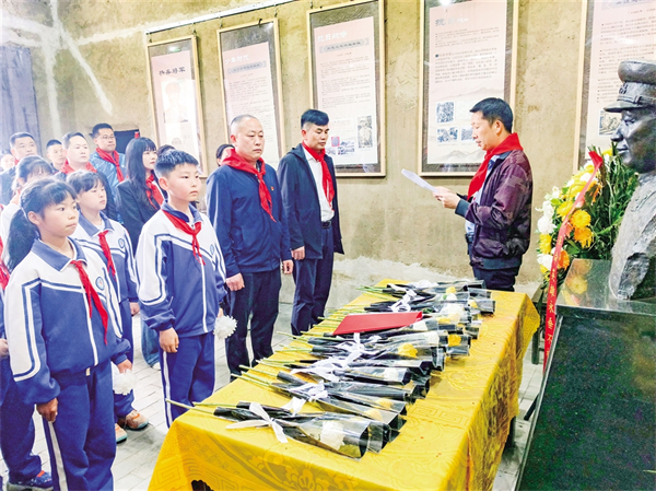 ▲ 4月1日,漢陰縣蒲溪鎮(zhèn)小學(xué)教育集團(tuán)師生代表在楊棄將軍故居開展主題黨日活動(dòng)。鄧永新 攝