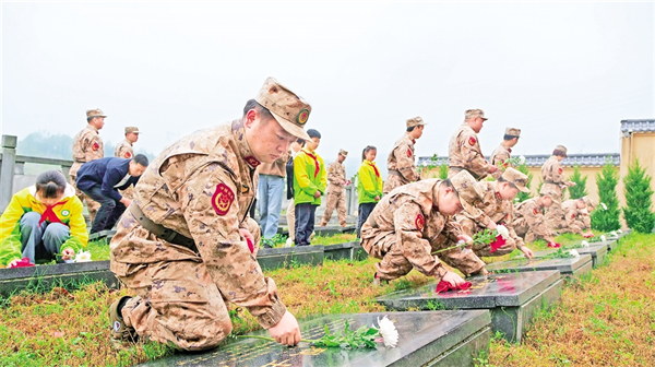 ▲ 4月3日,部分中小學(xué)生冒雨到烈士陵園祭奠革命先烈,緬懷革命先烈的豐功偉績,繼承他們的革命傳統(tǒng)。程方 攝