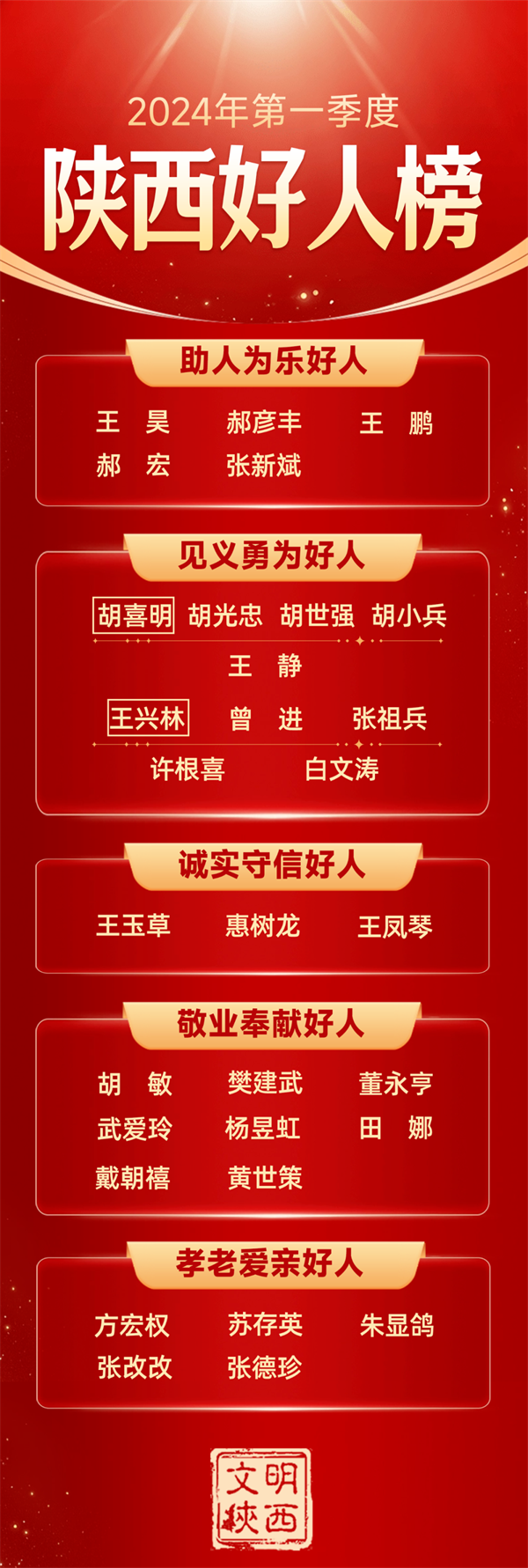 4月25日下午,2024年第一季度陜西好人榜發(fā)布儀式暨道德模范與身邊好人現(xiàn)場交流活動在西安市高陵區(qū)舉辦 。我市助人為樂好人張新斌,見義勇為好人王興林、曾進(jìn)、張祖兵,誠實守信好人王鳳琴光榮上榜,一起來看看他們的光榮事跡。