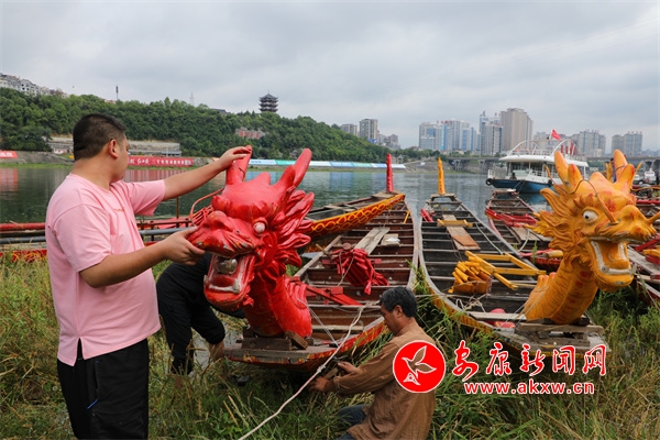 安康市體育服務管理中心主任、安康龍舟節(jié)主題活動水上導演劉平平介紹:“今天28支龍舟隊集結下水,下水后要安裝龍頭、龍尾、鑼架、鼓架和棹,達到翹頭翹尾的最美觀感。然后我們就要開始進行試水、適應性訓練、表演訓練和比賽項目訓練,爭取達到最佳的狀態(tài)參加比賽”。