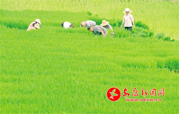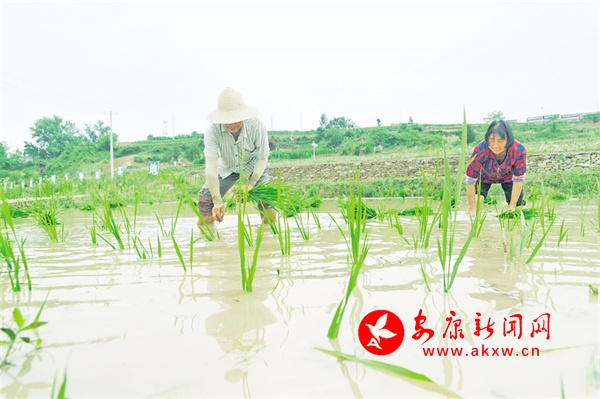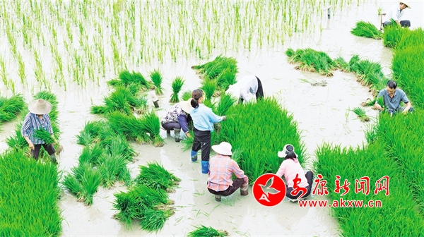 圖二:安康市恒口示范區(qū)袁莊村村民在進(jìn)行水稻秧苗移栽。趙華斌 攝