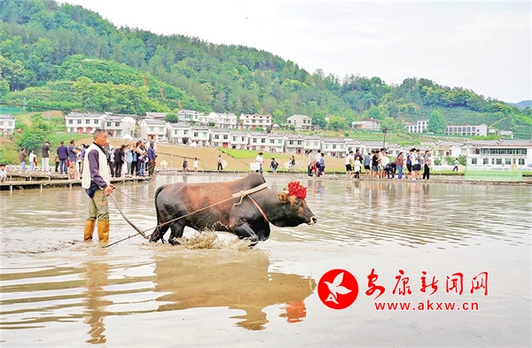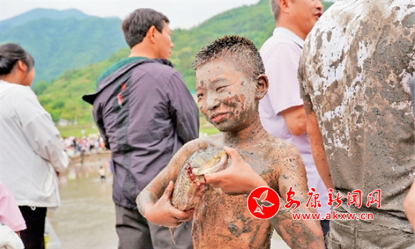 圖一:平利縣廣佛鎮(zhèn)第三屆插秧節(jié)上,游客和村民一起體驗(yàn)抓魚。王韜 攝