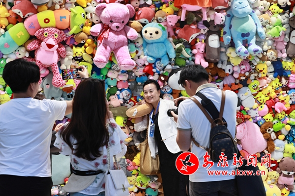 采訪團(tuán)在恒口示范區(qū)毛玩中心拍照打卡。記者 潘潤生 攝
