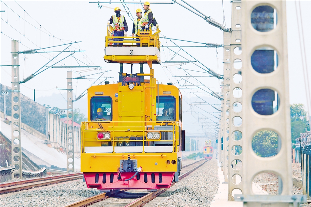 朱瑩駕駛軌道車配合接觸網(wǎng)工進(jìn)行日常檢修