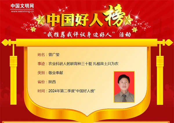 曾廣瑩,男,1966年10月生,中共黨員,陜西省鎮(zhèn)坪縣農(nóng)業(yè)科學研究所黨支部書記、副所長。曾廣瑩30年如一日行走于田間地頭,兢兢業(yè)業(yè)從事農(nóng)業(yè)示范研究和推廣工作,完成多個玉米新品種審定與大面積推廣,填補了中高山玉米品種空白,為秦巴地區(qū)糧食安全和玉米品種繁育作出了突出貢獻。曾廣瑩曾獲“農(nóng)業(yè)部全國農(nóng)牧漁業(yè)豐收獎(農(nóng)業(yè)技術(shù)推廣貢獻獎)”“陜西省優(yōu)秀共產(chǎn)黨員”“陜西好人”等榮譽。