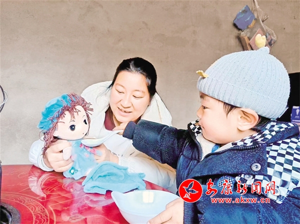 在城關鎮(zhèn)城北養(yǎng)育中心的教室內(nèi),養(yǎng)育師正在給孩子和家長進行一對一的課程輔導。“這是訓練寶寶生活習慣的,根據(jù)寶寶吃飯的步驟,通過游戲的方式來慢慢地讓他養(yǎng)成良好的生活習慣……”