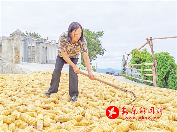 8月29日,在平利縣城關(guān)鎮(zhèn)普濟(jì)寺村徐家溝生態(tài)種養(yǎng)業(yè)家庭農(nóng)場(chǎng),張冬明頂著烈日,正在晾曬玉米棒子。