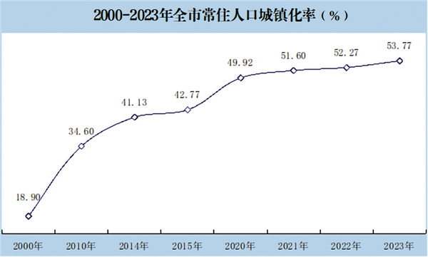 城鎮(zhèn)化步伐明顯加快。1949年,安康總人口146.75萬人,其中農業(yè)人口占89.4%,屬于典型傳統(tǒng)的農村社會,交通不便,人員相對封閉不流動。改革開放后,市場經(jīng)濟體制逐步建立,特別是2000年撤地設市,對安康具有劃時代和里程碑的意義。2021年旬陽撤縣設市,成為陜南首個縣級市,標志著全市城鎮(zhèn)化步伐邁向更高水平。全市抓住東部勞動密集型產(chǎn)業(yè)向中西部轉移的機遇,依托易地搬遷集中安置點,大力興辦新社區(qū)工廠,把農民變?yōu)榫用,大力開展新環(huán)境、新服務、新產(chǎn)業(yè)、新民風、新生活“五新”社區(qū)創(chuàng)建工作,完善配套設施,健全服務體系,城鎮(zhèn)化建設步伐顯著加快。2023年,全市戶籍人口300.75萬人,常住人口245.72萬人。常住人口城鎮(zhèn)化率由2000年的18.9%,提高到2023年的53.77%,23年間提高了34.87個百分點。