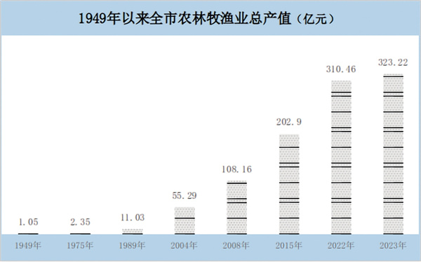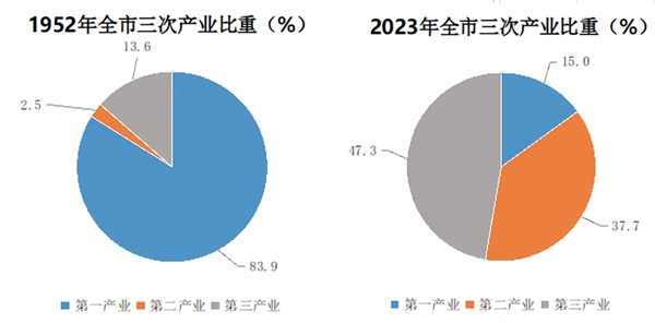 產(chǎn)業(yè)結構日趨優(yōu)化。1952年,全市三次產(chǎn)業(yè)比為83.9︰2.5︰13.6,產(chǎn)業(yè)結構呈“一、三、二”模式,為典型的農業(yè)市,隨著工業(yè)經(jīng)濟和第三產(chǎn)業(yè)的不斷發(fā)展,全市第一產(chǎn)業(yè)比重逐年下降,二、三產(chǎn)業(yè)比重逐年上升,2012年三次產(chǎn)業(yè)比為19.4︰42.7︰37.9,第一產(chǎn)業(yè)占比首次低于20.0%,第二產(chǎn)業(yè)突破40.0%,產(chǎn)業(yè)結構呈“二、三、一”模式;隨著第三產(chǎn)業(yè)不斷壯大,2020年占比45.3%,躍居三產(chǎn)之首,呈“三、二、一”模式,并連續(xù)保持4年,2023年全市三次產(chǎn)業(yè)之比15.0︰37.7︰47.3,以服務業(yè)為主的產(chǎn)業(yè)結構加速形成。