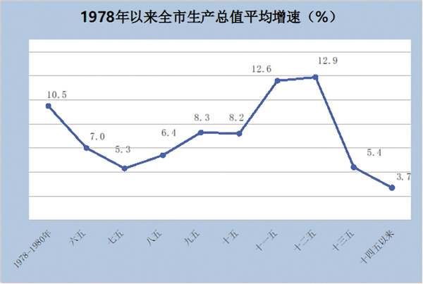 追趕超越步履堅實。從增速看,“六五”到“十五”年均增速為個位數(shù);“十一五”“十二五”時期發(fā)展較快,年均增速兩位數(shù),“十三五”年均增長5.4%,“十四五”前三年平均增長3.7%。從具體年份看,2007—2016年連續(xù)10年保持兩位數(shù)增長,其中2012年增長15.2%。自2009年起,全市GDP增速持續(xù)高于全省平均水平,尤其是2015年躍居全省第一,2015—2019年連續(xù)5年保持全省首位,呈后來居上、追趕超越之勢。2020年受疫情沖擊,增速回落至全省第9位,2023年全市經(jīng)濟平穩(wěn)恢復,增長1.7%,發(fā)展進入新常態(tài)。
