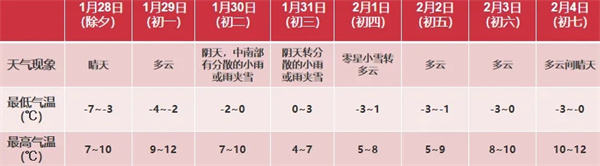 春節(jié)期間,除夕至初一,天氣晴朗,適宜出行游玩,但早晚氣溫低,注意適時增減衣物。初二至初四云量較多,有分散性小雨或雨夾雪,高山地區(qū)有小雪,去高山景區(qū)的公眾需注意做好防寒保暖和防滑措施。