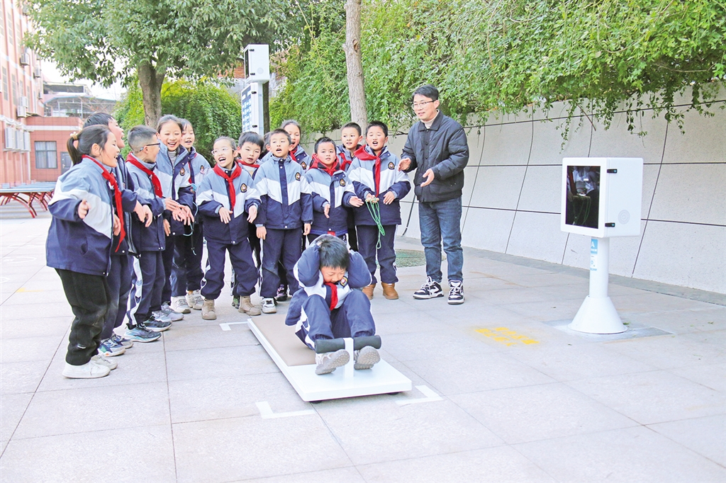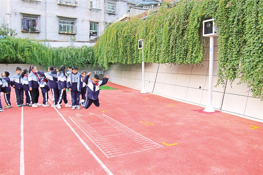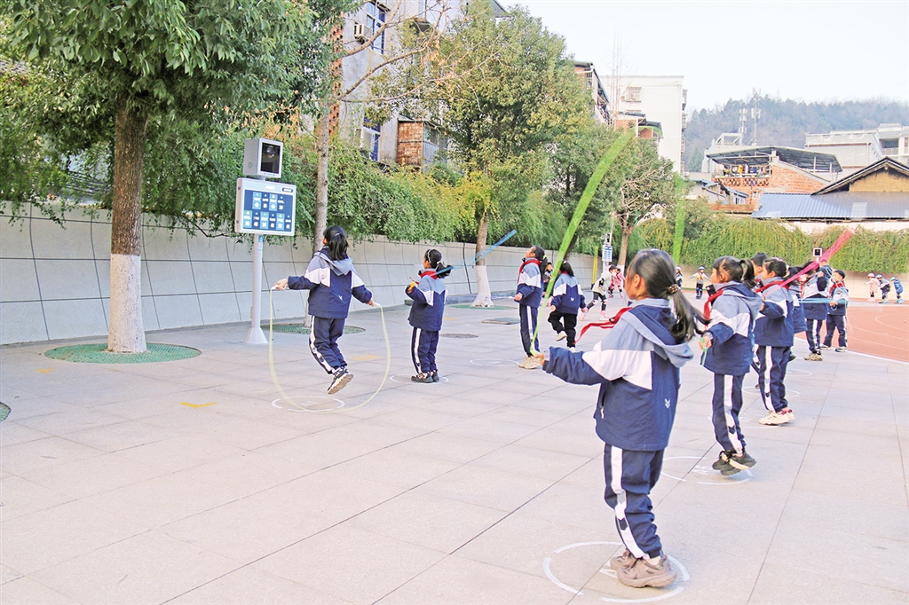 學(xué)生在AI智慧體育運(yùn)動儀器感應(yīng)區(qū)內(nèi)跳繩。