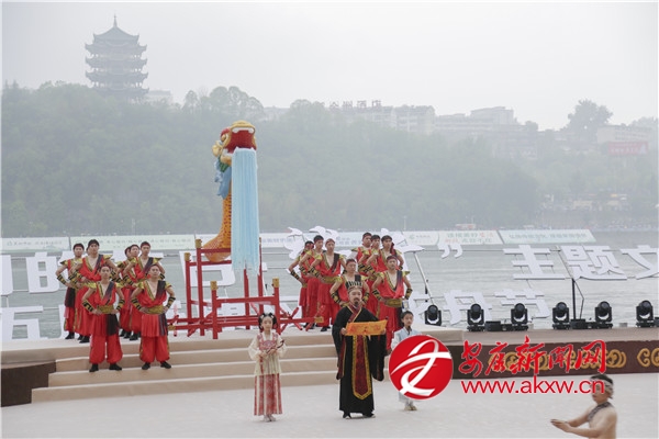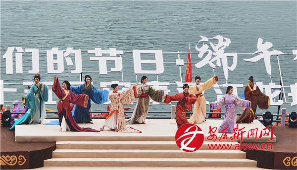 活動(dòng)現(xiàn)場(chǎng),6聲渾厚鐘聲劃破長(zhǎng)空。“緬懷先賢……”隨著主祭官畫外音傳來,60名身著青綠漢服的女子手捧香粽菖蒲,踏古琴清音翩躚而出。屈原塑像被緩緩護(hù)送入舞臺(tái)中央,112名身著漢服的學(xué)童齊聲詠頌祭文的聲浪在江岸回蕩。隨著粽拋碧波,香囊、梔子花贈(zèng)客,流淌千年的龍舟文化,化作平安順利、幸福安康的當(dāng)代回響。