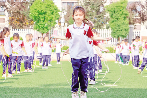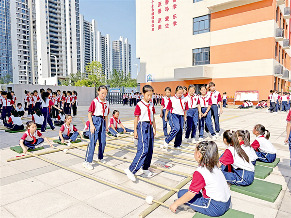 這所建校僅一年多的學(xué)校,通過創(chuàng)新構(gòu)建“138+X”體育活動體系,讓體教融合從理念走向?qū)嵺`。“‘1’是每天10分鐘眼保健操,‘3’是30分鐘體育課,‘8’是80分鐘大課間,‘X’則是清晨微鍛煉和社團活動。”該校體育教研組組長陳波介紹道,“通過科學(xué)規(guī)劃,我們確保每個孩子每天都能享受2小時的運動時光。”這一體系的設(shè)計,正是對中共中央、國務(wù)院提出的“中小學(xué)生每天綜合體育活動時間不低于2小時”要求的創(chuàng)新落實,也體現(xiàn)了學(xué)校對“健康第一”教育理念的深刻理解。