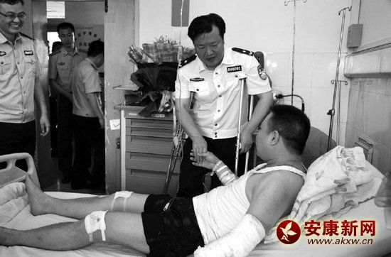 安康市公安局局長看望王曉勇 本報(bào)記者吳琛攝 “為抓捕犯罪嫌疑人,他被拖行100余米,全身多處擦傷,警察兄弟辛苦了!”、“用你的傷痛,換來……