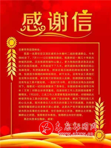 從感謝信中獲知:家住漢濱區(qū)建民辦長(zhǎng)春村二組的尤大爺年近八旬,因7月11—12日強(qiáng)降雨導(dǎo)致附近一棵幾十年的大樹被風(fēng)刮倒,壓在他家院墻和山墻上,更為危險(xiǎn)的還危及近在咫尺的高壓線路。供電部門對(duì)高壓線路的樹枝做了清理,但因倒塌大樹粗壯,樹干太長(zhǎng),沒(méi)有專業(yè)工具處理,仍存在較大安全隱患。老大爺突然想到曾在路邊看到市政人員對(duì)行道樹進(jìn)行修剪,于是抱著試試的心態(tài)撥打了安康市市政園林處電話。接到求助后,該處綠化管護(hù)科當(dāng)天下午派了2名專業(yè)人員趕往現(xiàn)場(chǎng),對(duì)該樹干進(jìn)行分段切割移除,解決了困擾老大爺?shù)男念^大患。老大爺對(duì)市政園林處及時(shí)高效辦理群眾煩心事、操心事非常感激,連夜寫信并通過(guò)快遞形式寄到市政園林處。一封感謝信只是市政園林處踐行開展黨史學(xué)習(xí)教育“我為群眾辦實(shí)事”主題實(shí)踐活動(dòng)的一個(gè)縮影。自黨史學(xué)習(xí)教育以來(lái),市政園林處以學(xué)踐用,以學(xué)促干,累計(jì)為群眾辦實(shí)事11件,扎實(shí)推進(jìn)市政園林項(xiàng)目建設(shè),社區(qū)群眾自發(fā)送來(lái)錦旗2面,各級(jí)媒體爭(zhēng)相報(bào)道。
