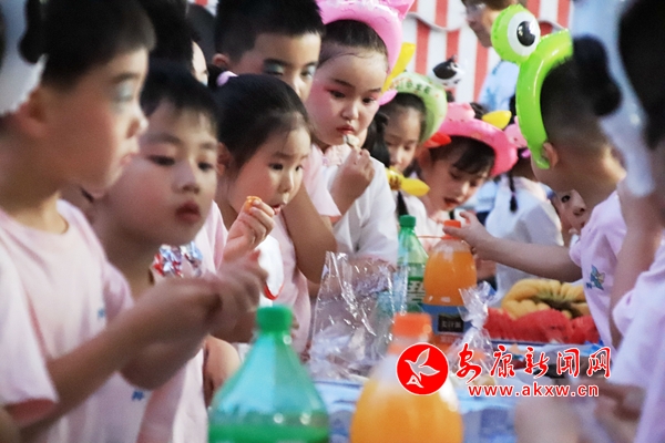 一段溫馨的共話離別。演出結束后,幼兒園給小朋友們準備了各種美食,在五彩斑斕的夜光下自選幾種美食,好朋友們在一起,品嘗美食,聊聊幼兒園開心的事情,談談喜歡的東西。