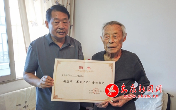 6月28日,安康市書香少兒讀書會負(fù)責(zé)人來到漢陰縣城,慰問93歲的老黨員鄺民三,聘請他為安康市書香少兒讀書會“愛心大使”。