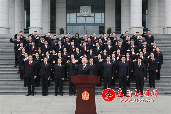 上午10時,在莊嚴的國歌聲中,四名法警正步護送國旗入場。隨后,院長劉娟走向領(lǐng)誓臺,左手撫按憲法,右手舉拳,領(lǐng)誦誓詞。全體班子成員、法官干警共67人高舉右拳,以錚錚誓言許下對憲法的忠誠和對人民的莊嚴承諾。