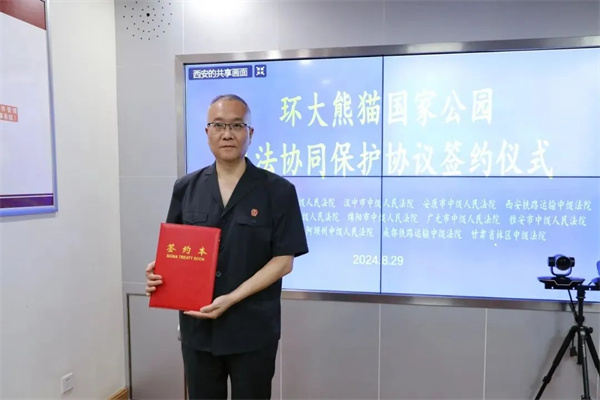 西安市中級人民法院黨組書記、院長趙雷、西安鐵路運輸中級法院黨組副書記、副院長王琪軒、四川省成都市中級人民法院黨組成員、副院長謝立新、成都鐵路運輸中級法院黨組成員、副院長徐翔、甘肅省林區(qū)中級法院黨組成員、副院長唐開明分別致辭。西安市中級人民法院審判委員會專職委員張曼慧介紹《環(huán)大熊貓國家公園司法協同保護協議》的主要內容。