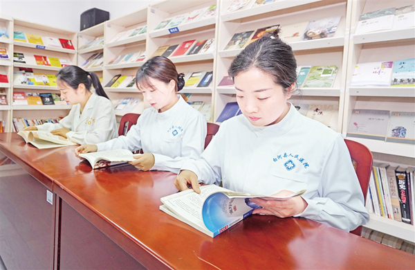 4月23日,白河縣人民醫(yī)院護(hù)士利用工作間隙在圖書(shū)角專(zhuān)注閱讀。(伍渭康 攝)