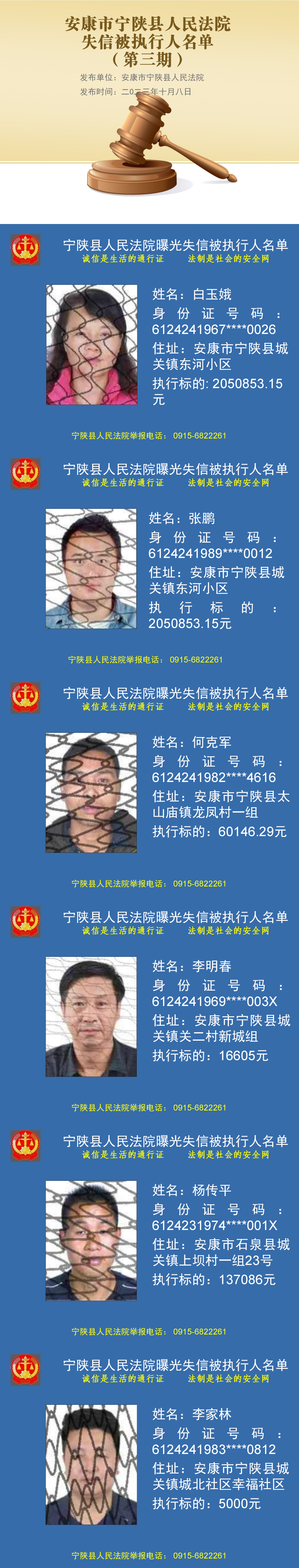 為維護(hù)司法權(quán)威,推動(dòng)社會(huì)誠(chéng)信體系建設(shè),促使被執(zhí)行人履行生效法律文書確定的義務(wù),根據(jù)《中華人民共和國(guó)民事訴訟法》第二百五十五條和《最高人民法院關(guān)于公布失信被執(zhí)行人名單信息的若干規(guī)定》的規(guī)定,被執(zhí)行人具有履行能力而不履行生效法律文書確定的義務(wù),人民法院應(yīng)當(dāng)將其納入失信被執(zhí)行人名單,依法對(duì)其進(jìn)行信用懲戒。現(xiàn)將安康市寧陜縣人民法院2023年第三期失信被執(zhí)行人名單予以公布。