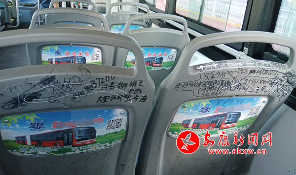 7月7日,筆者乘坐安康市城區(qū)7路公交車發(fā)現(xiàn),公交座椅靠背慘遭“涂鴉”,內(nèi)容不乏廣告標(biāo)語(yǔ)、低俗粗鄙、不堪入目的語(yǔ)言,嚴(yán)重影響乘車心情。希望廣大乘客文明乘車,還市民一個(gè)干凈整潔的乘車環(huán)境。(通訊員 成忠旭)siz安康新聞網(wǎng)