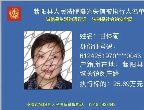 被執(zhí)行人甘體菊,你因不履行(2017)陜0924民初241號民事判決書確定的義務(wù),已被紫陽縣人民法院納入失信被執(zhí)行人名單庫依法進(jìn)行信用懲戒。信用懲戒范圍包括但不限于以下措施: