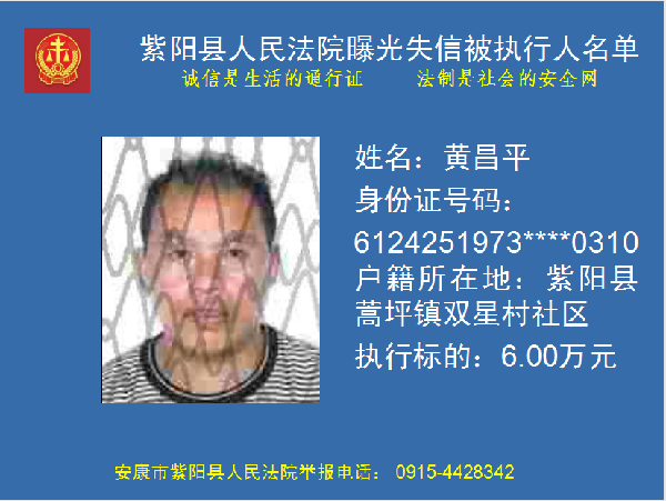 被執(zhí)行人黃昌平,你因不履行(2017)陜0924民初241號(hào)民事判決書(shū)確定的義務(wù),已被紫陽(yáng)縣人民法院納入失信被執(zhí)行人名單庫(kù)依法進(jìn)行信用懲戒。信用懲戒范圍包括但不限于以下措施: