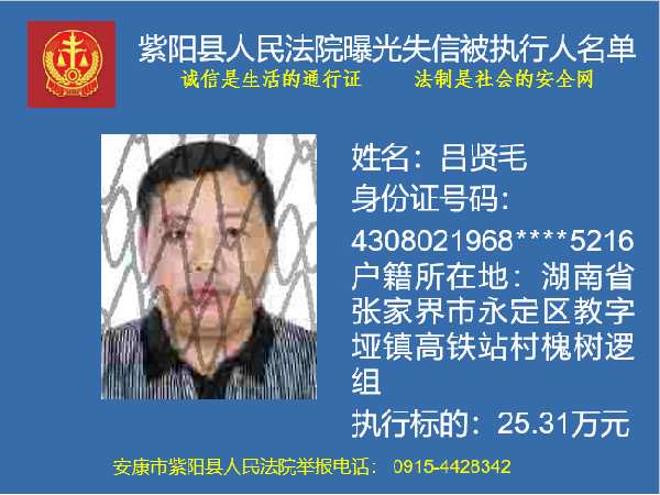 被執(zhí)行人呂賢毛,你因不履行(2017)陜0924民初241號(hào)民事判決書(shū)確定的義務(wù),已被紫陽(yáng)縣人民法院納入失信被執(zhí)行人名單庫(kù)依法進(jìn)行信用懲戒。信用懲戒范圍包括但不限于以下措施: