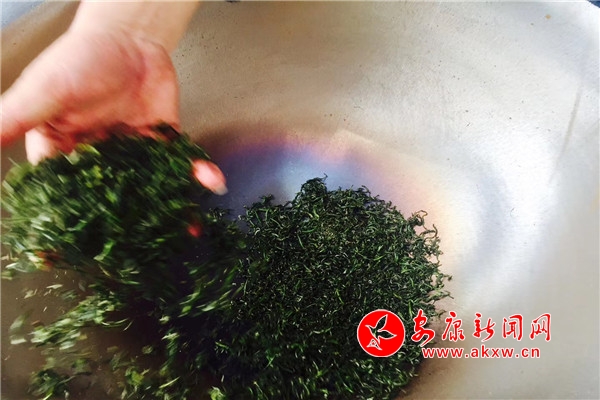 活動(dòng)現(xiàn)場(chǎng),三口電炒鍋一字排開,三位炒茶師傅雙手翻飛,嫩綠的鮮葉在他們手中滾動(dòng)擠壓,揉捻、殺青、焙烘......最終成為我們常見的毛尖茶葉。