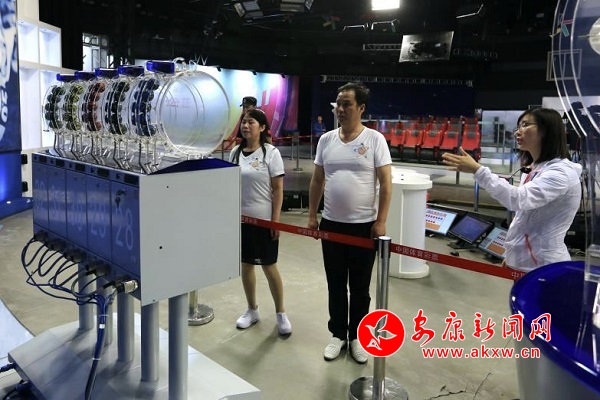 19時(shí),安康觀摩團(tuán)在工作人員的指導(dǎo)下,進(jìn)行了嚴(yán)格有序的安檢工作。每個(gè)人都需要將隨身所帶物品全部放入存儲(chǔ)柜。所有人員安檢結(jié)束后,通過專用通道,憑實(shí)名認(rèn)證的通行證進(jìn)入開獎(jiǎng)直播大廳。待大家整齊落座開獎(jiǎng)直播大廳后,工作人員再次講解注意事項(xiàng),并邀請(qǐng)觀摩團(tuán)收看了開獎(jiǎng)場(chǎng)地介紹、開獎(jiǎng)流程、數(shù)據(jù)封存及搖獎(jiǎng)設(shè)備四個(gè)短視頻。工作人員還將試機(jī)球發(fā)給觀摩團(tuán)成員,讓大家真實(shí)感受搖獎(jiǎng)球的質(zhì)地,四名幸運(yùn)站長(zhǎng)被邀請(qǐng)到臺(tái)上零距離參觀搖獎(jiǎng)設(shè)備。