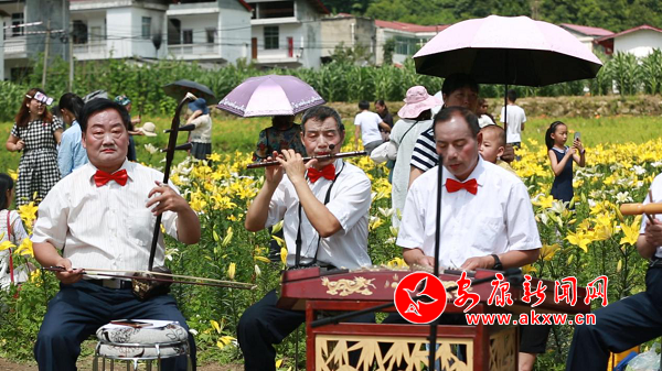 主辦方在整片花園設置了不同主題的賞花區(qū)域,供游人欣賞拍照。以愛為主題的紅色百合花海中,有村里的金婚老人正在拍攝寓意百年好合的浪漫婚紗照;在花田書法主題園中,有知名書法家正在揮毫有關(guān)百合的詩詞,引得眾多游人駐足觀看。各村村民和南山燕公司還布設了展位,推介銷售地方農(nóng)特產(chǎn)品及手工藝品。