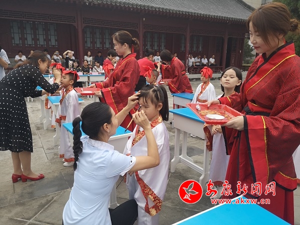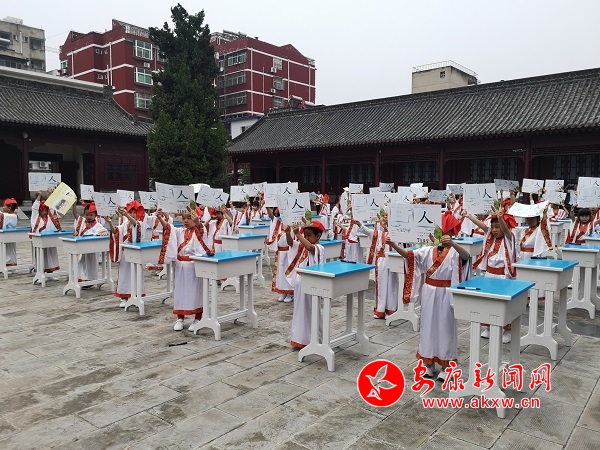 據(jù)了解,“開(kāi)筆禮”是中國(guó)古代人生“四大禮”之首,是蒙童入學(xué)階段極為重要的儀式。“開(kāi)筆禮”儀式主要分成六項(xiàng)內(nèi)容,每一項(xiàng)內(nèi)容承載著特定的教育目的。“正衣冠”要求學(xué)子們養(yǎng)成干凈整潔的生活習(xí)慣;“感恩鞠躬”讓學(xué)子向師長(zhǎng)行揖禮,謝師恩、謝親恩,并為師者和長(zhǎng)輩奉茶,讓他們從小懂得孝親尊師的道理;“凈手凈心”讓學(xué)子們從此靜心讀書(shū),心無(wú)旁騖;“朱砂啟智”,表達(dá)了師長(zhǎng)對(duì)學(xué)子們的美好祝愿,希望他們心明眼亮,聰慧過(guò)人;“擊鼓明志”讓學(xué)子們樹(shù)立遠(yuǎn)大的理想與目標(biāo);“開(kāi)筆啟蒙”書(shū)寫(xiě)“人”字,學(xué)會(huì)做人的道理。蒙童通過(guò)親身經(jīng)歷這種莊嚴(yán)古樸的儀式,實(shí)現(xiàn)從蒙童到學(xué)生的心理過(guò)渡。