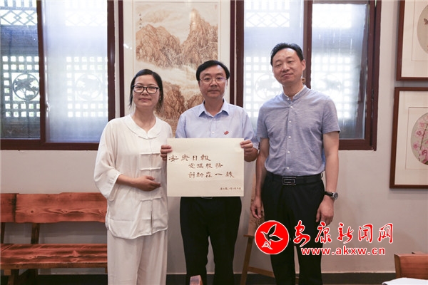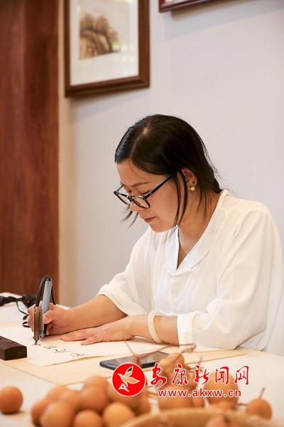 6月24日,李紅霞為安康日?qǐng)?bào)社烙畫作字——“黨媒服務(wù)創(chuàng)新在一線”。烙畫又稱火筆畫,中國傳統(tǒng)藝術(shù)珍品,用火燒熱烙鐵在物體上熨出烙痕作畫。烙畫創(chuàng)作在把握火候、力度的同時(shí),注重“意在筆先、落筆成形”。