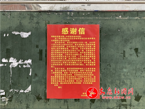 11月23日早上6:50分左右,安康市第二中學(xué)高二學(xué)生石夢(mèng)林像往常一樣去上課。在經(jīng)過(guò)安康市人民醫(yī)院十字路口時(shí),他看到一輛疾馳而過(guò)的三輪車將一人(李先生)撞倒在地,司機(jī)未理會(huì)傷者,準(zhǔn)備逃逸。石夢(mèng)林毫不猶豫地向肇事車追去,試圖阻攔。奮力追逐二百余米后,未能阻攔成功。他又立即返回,將傷者扶至路邊,用自己手機(jī)撥通了報(bào)警電話,詢問(wèn)了傷者家人聯(lián)系方式,聯(lián)系上家屬后將傷者送往醫(yī)院救治。