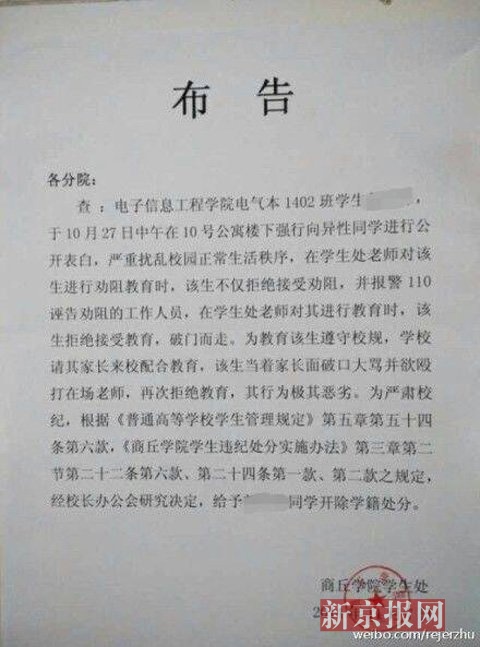 新京報快訊(記者 程媛媛 實習生 顧開貴 趙吉翔)今日(11月10日),河南商丘學院一份“布告”在網(wǎng)上流傳,“布告”稱該校男生郭某“強行”向異性表白,嚴重擾亂校園秩序,校方依據(jù)相關(guān)規(guī)定給予郭某開除學籍處分。該校多名學生向新京報記者證實校內(nèi)多個分院均貼有此布告。