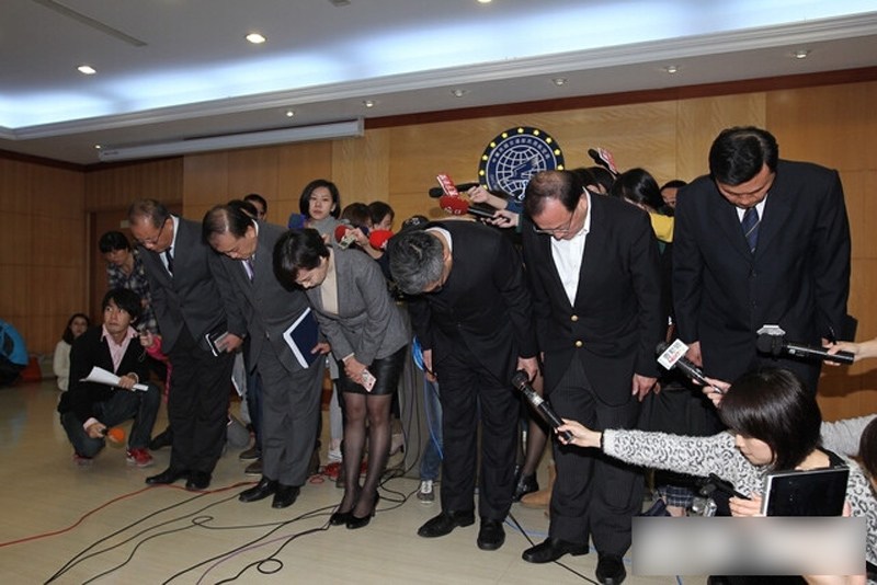 復興航空執(zhí)行長陳欣德2月4日下午率復航高層召開記者會,會前所有干部鞠躬道歉。陳欣德說,深深感到抱歉,致上十二萬分歉意。圖為現(xiàn)場。ep2安康新聞網(wǎng)