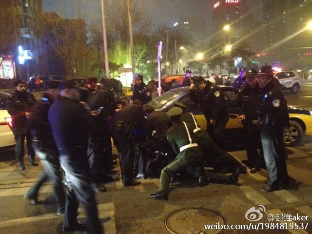 當(dāng)時(shí)附近行人很多,該男子先是由西往東走了一小段,“這時(shí)候店內(nèi)沖出來了兩名身穿西服的男性工作人員,拿著金屬制品開始追趕該男子,”該男子見狀從兜里掏出了一把長約20公分的水果刀,一邊罵人,一邊越過馬路由東往西跑,兩名男店員在后面緊追不舍。圖為網(wǎng)傳抓捕現(xiàn)場。DGz安康新聞網(wǎng)