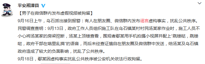 9月19日,湘潭縣警方通過官方微博表示,9月16日上午,烏石派出接到報警電話:有人在朋友圈、微信群內(nèi)發(fā)布謠言,擾亂公共秩序。民警調(diào)查查明:9月13日,政府工作人員組織施工隊在烏石鎮(zhèn)村民湯某家作業(yè)時,施工人員不小心將湯某家的房梁挖斷。隨后,湯某上頂樓查看,圍觀者鄢某用手機拍攝小視頻并配上“跳樓噠,跳樓噠,政府干部在這里亂搞”的語音,在未經(jīng)查證的情況下,擅自發(fā)送至朋友圈以及微信群中,給湯某及烏石鎮(zhèn)政府造成了較大的負面影響。