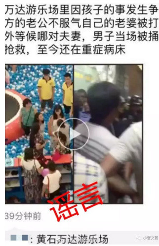 【傳聞】湖北黃石、湖南湘潭、益陽以及山東煙臺等地傳出“在萬達廣場一樓游樂場,兩位母親因為娃娃的事發(fā)生爭吵,隨后,一女子老公因不服氣自己的老婆被打,叫人在萬達外等候里面那對夫妻,男子當場被捅死,女的還在搶救,至今還在重癥病床”。
