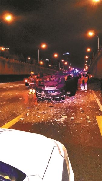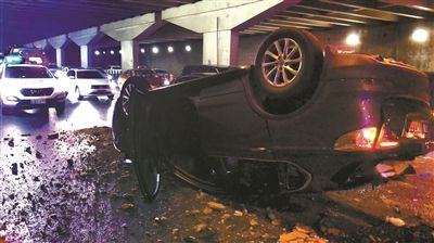 目擊者拍攝的現(xiàn)場(chǎng)照片顯示,這輛黑色小轎車“四腳朝天”摔在農(nóng)展橋下的三環(huán)主路上,車頭及駕駛艙部位受損嚴(yán)重,地面上滿是玻璃碎片。農(nóng)展橋橋面一側(cè)的護(hù)欄也被破壞,被汽車撞下橋面。