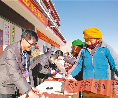 1月7日,第八批援藏干部中的20多名書法愛好者和西藏自治區(qū)書法家協(xié)會部分會員來到位于拉薩河畔的曲水縣三有村,為當(dāng)?shù)?84戶藏漢群眾現(xiàn)場寫福字,送春聯(lián)。