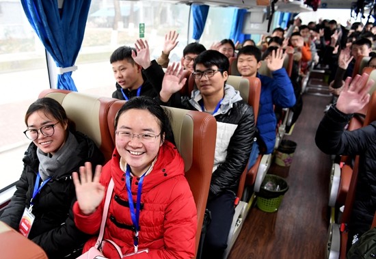 當日,2018接阜陽籍大學生回家活動在安徽農(nóng)業(yè)大學啟動,來自安徽農(nóng)業(yè)大學、安徽醫(yī)科大學、合肥工業(yè)大學等高校的200余名阜陽籍大學生免費乘坐大巴車返回家鄉(xiāng)過年。新華社記者 劉軍喜 攝s3Y安康新聞網(wǎng)