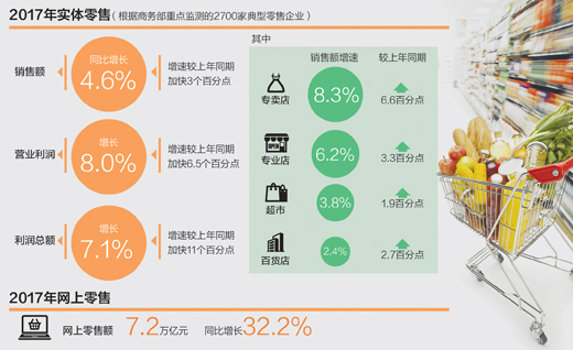 商務(wù)部近日發(fā)布的數(shù)據(jù)顯示,去年我國實(shí)體零售發(fā)展態(tài)勢良好,重點(diǎn)監(jiān)測的2700家典型企業(yè)銷售額同比增長4.6%,增速較上年同期加快3個百分點(diǎn)。去年我國網(wǎng)上零售額突破7.2萬億元,同比增長32.2%。