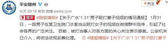 通報(bào)中稱,2018年1月31日上午10時(shí)許,在廣水市廣水街道辦事處的一家衛(wèi)生院,一名男子暴力毆打一名女子。事發(fā)時(shí),該衛(wèi)生院領(lǐng)導(dǎo)及時(shí)趕到現(xiàn)場(chǎng)勸解制止。廣水市公安局廣水派出所接到報(bào)警后,及時(shí)出警調(diào)查。據(jù)警方初步調(diào)查,被打女子為該衛(wèi)生院的一名職工,打人男子系其丈夫,打人事件因家庭矛盾糾紛引發(fā)。