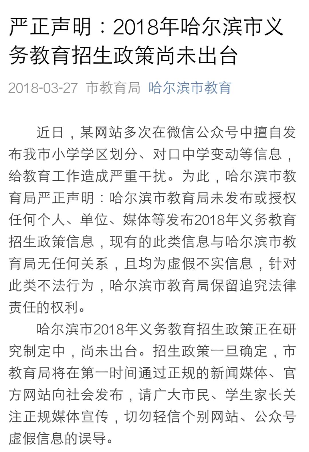 官方聲明表示,近日,某網(wǎng)站多次在微信公眾號中擅自發(fā)布我市小學(xué)學(xué)區(qū)劃分、對口中學(xué)變動(dòng)等信息,給教育工作造成嚴(yán)重干擾。為此,哈爾濱市教育局嚴(yán)正聲明:哈爾濱市教育局未發(fā)布或授權(quán)任何個(gè)人、單位、媒體等發(fā)布2018年義務(wù)教育招生政策信息,現(xiàn)有的此類信息與哈爾濱市教育局無任何關(guān)系,且均為虛假不實(shí)信息,針對此類不法行為,哈爾濱市教育局保留追究法律責(zé)任的權(quán)利。